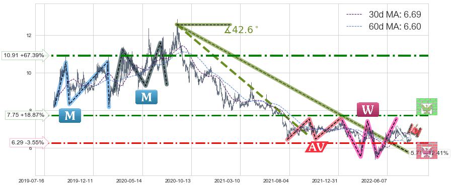 ➢ 【仅预测突破】最后价格:6.52与预测突破价格:7.27→【空间较大】后续最小【反转】第一目标价格→(2022-10-31: 8.68 )