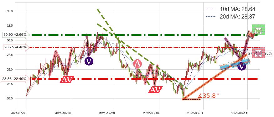 ♘ 阻力价格位30.90,可信任强度94.71%,距离最后交易2022-08-12形成的收盘价格30.10相差 +2.66%