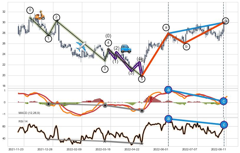 ➣ 第一, 三, 五浪上涨动能逐渐【衰弱变小】,趋势呈现不稳迹象