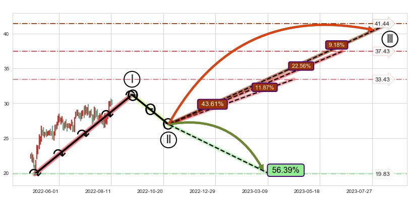 ➢ 循环浪继续向上【最低】位置(2023-04-13, 33.43),匹配聚类样本比例27.22%, 可能性概率11.87%