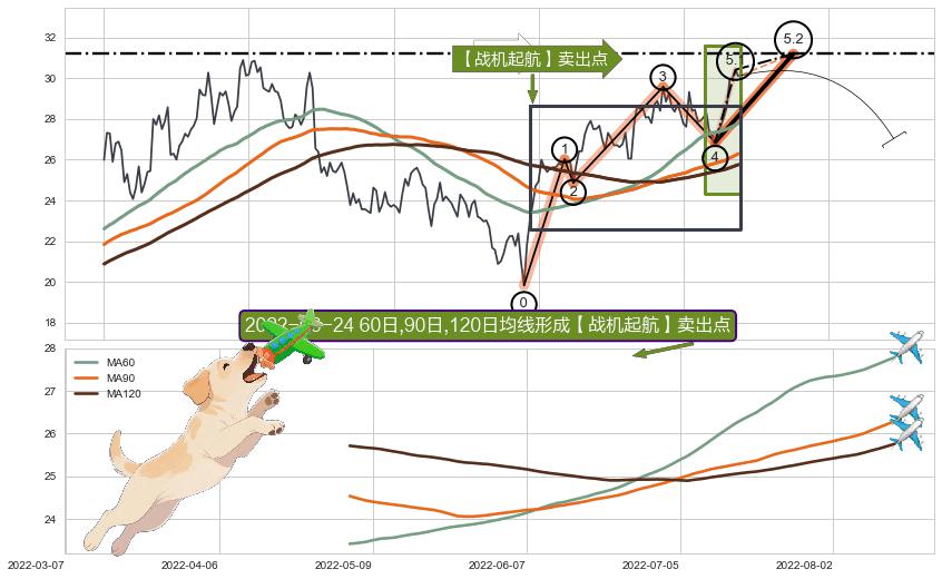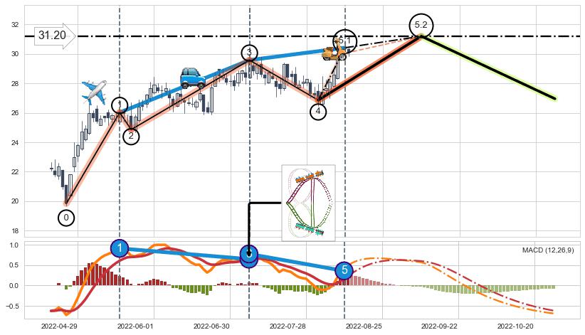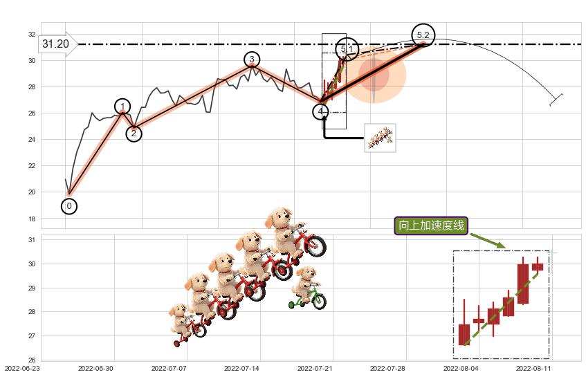 ➣ 5.1: 预测当前第5浪位置(2022-08-11, 30.42),仍然有上升空间