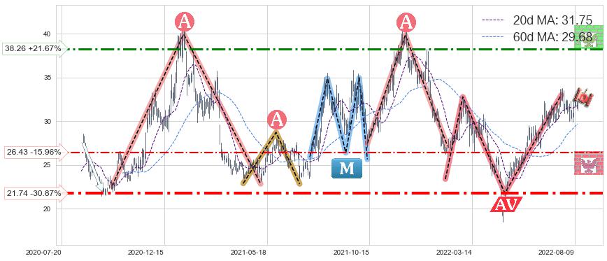 ♘ 阻力价格位38.26,可信任强度67.44%,距离最后交易2022-08-12形成的收盘价格31.45相差 +21.67%