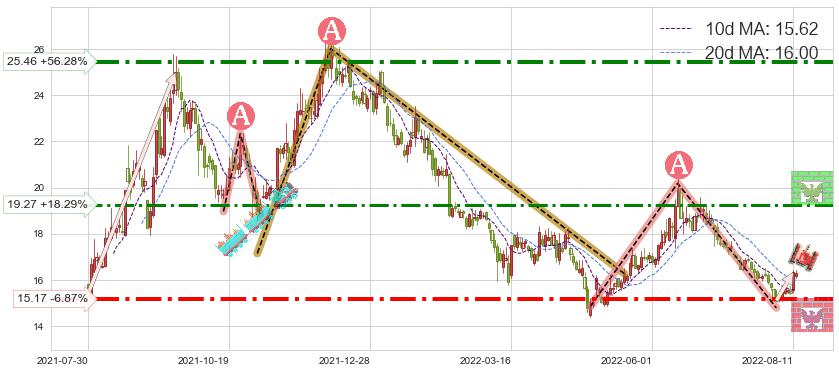 ♘ 阻力价格位19.27,可信任强度65.24%,距离最后交易2022-08-12形成的收盘价格16.29相差 +18.29%