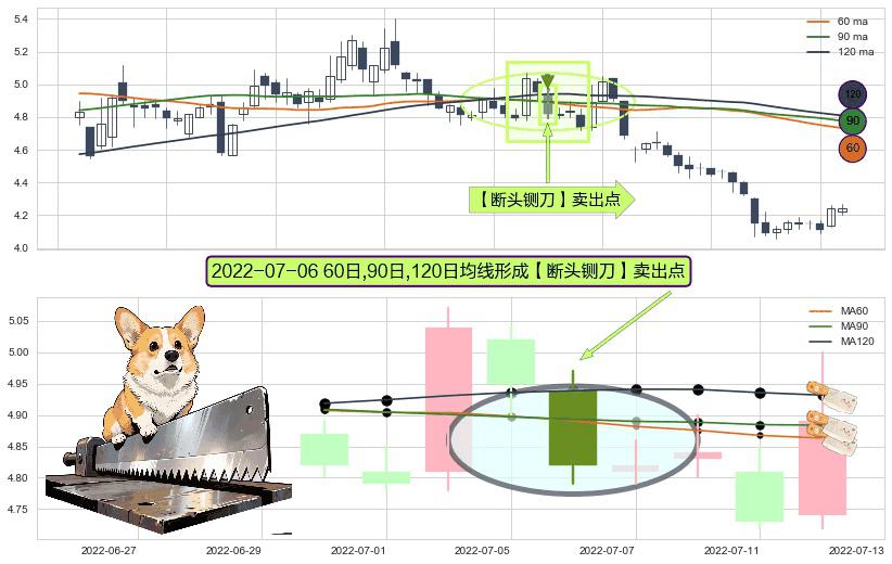 ⚀ 2022-07-06日显现 60日-90日-120日均线 【断头铡刀】卖出点 看空信号,后市看跌,卖出
