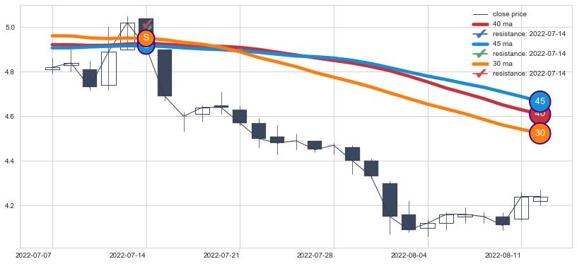 ➢ 最优均线组合共正确确认支撑阻力信号2处,正确确认率 50.00%
