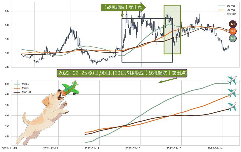 ⚀ 2021-12-30日-2022-04-19日显现 60日-90日-120日均线 【战机起航】卖出点 看空信号,后市看跌,卖出