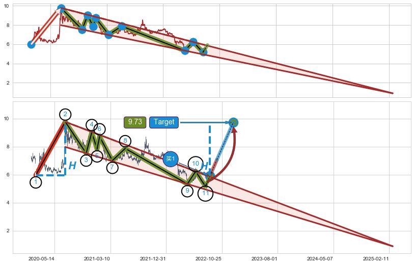 ➣ 【未确认突破,预测即将形成突破】降🚩楔型起点:2020-02-04, 预测突破点:2022-08-25,形态共626交易日