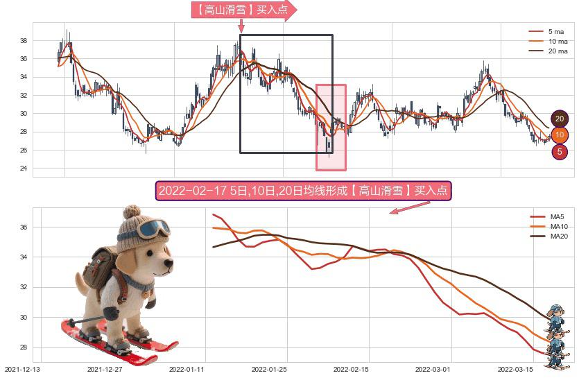 ⚀ 2022-01-12日-2022-03-17日显现 5日-10日-20日均线 【高山滑雪】买入点 看多信号,后市看涨,买入