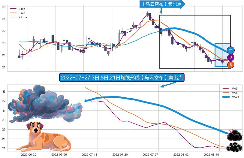 ⚀ 2022-07-11日-2022-08-12日显现 3日-8日-21日均线 【乌云密布】卖出点 看空信号,后市看跌,卖出