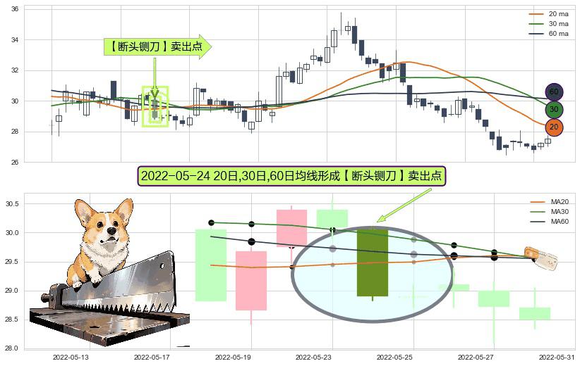 ⚀ 2022-05-24日显现 20日-30日-60日均线 【断头铡刀】卖出点 看空信号,后市看跌,卖出