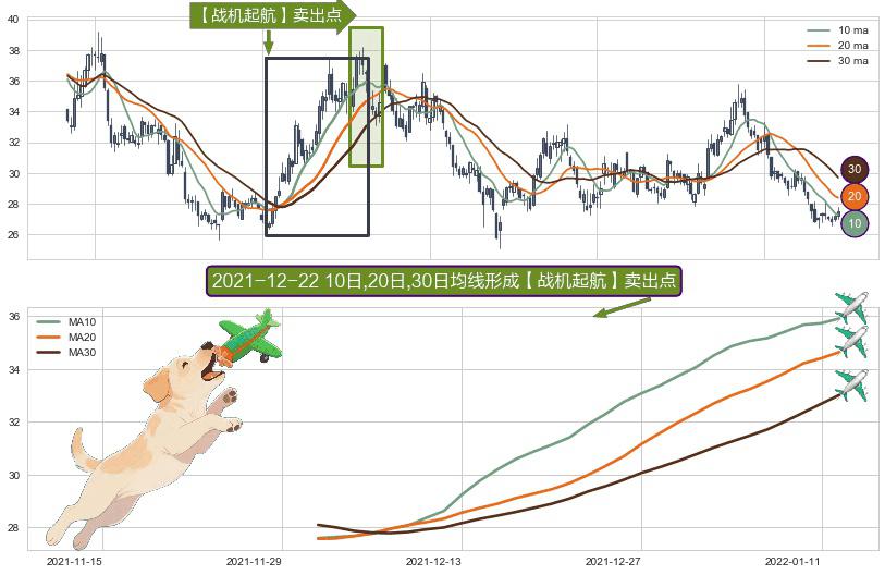 ⚀ 2021-12-01日-2022-01-12日显现 10日-20日-30日均线 【战机起航】卖出点 看空信号,后市看跌,卖出