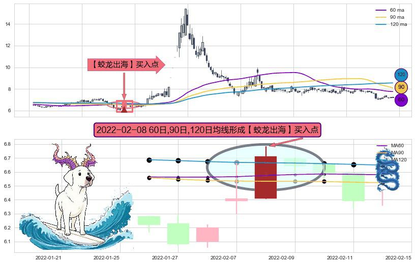 ⚀ 2022-02-08日显现 60日-90日-120日均线 【蛟龙出海】买入点 看多信号,后市看涨,买入