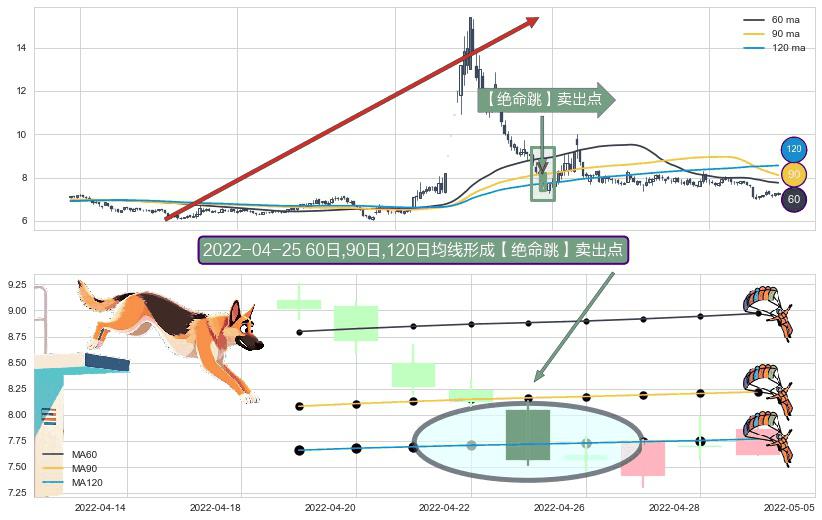 ⚀ 2022-04-25日显现 60日-90日-120日均线 【绝命跳】卖出点 看空信号,后市看跌,卖出