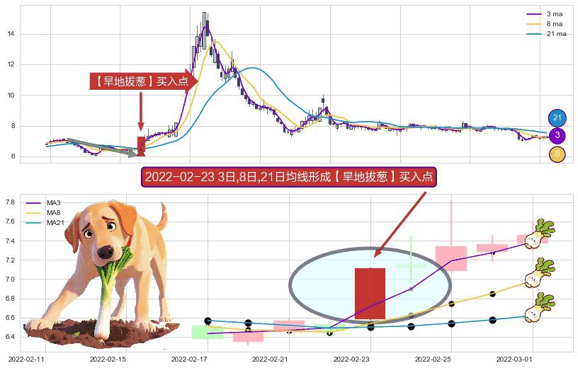 ⚀ 2022-02-23日显现 3日-8日-21日均线 【旱地拔葱】买入点 看多信号,后市看涨,买入
