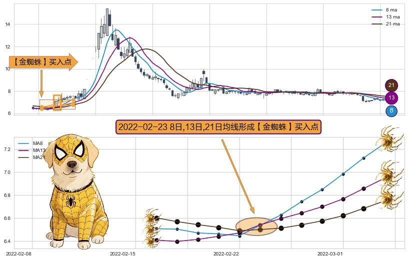 ⚀ 2022-02-23日显现 8日-13日-21日均线 【金蜘蛛】买入点 看多信号,后市看涨,买入