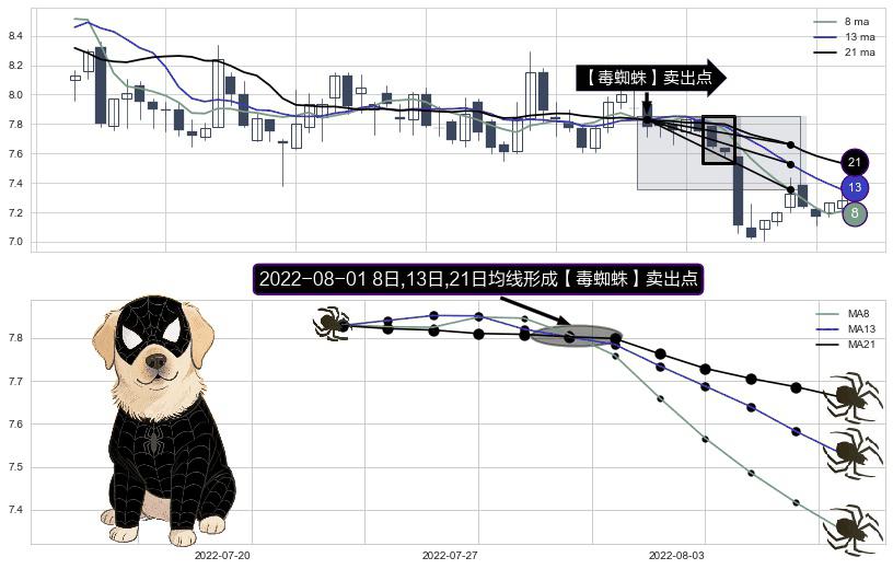 ⚀ 2022-08-01日显现 8日-13日-21日均线 【毒蜘蛛】卖出点 看空信号,后市看跌,卖出
