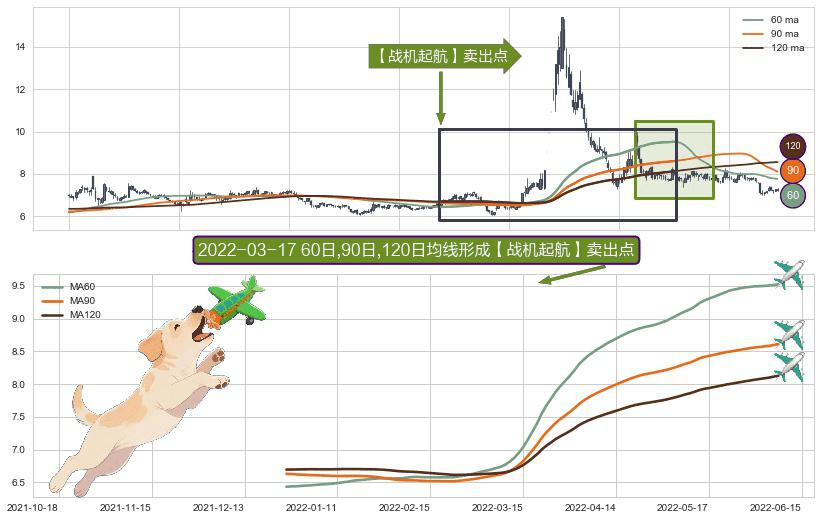 ⚀ 2021-12-24日-2022-06-08日显现 60日-90日-120日均线 【战机起航】卖出点 看空信号,后市看跌,卖出