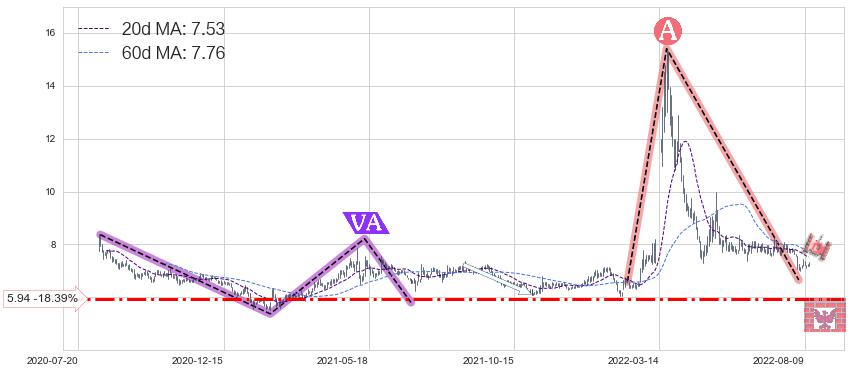 ♘ 支撑价格位5.94,可信任强度62.21%,距离最后交易2022-08-12形成的收盘价格7.28相差 -18.39%