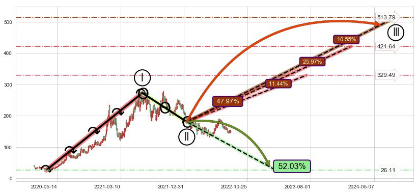 ➣ 调整浪已超过预测的c点位置,但后续大趋势循环浪高概率反转下跌,继续上涨概率47.97%,谨慎做多