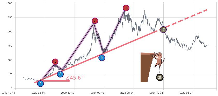 ➣ 2020-03-23-2021-11-12上升趋势存在反转[风险],其原上升趋势的支撑位(277.05)已破位[强阻力信号],原上升趋势角度: 45.6˚