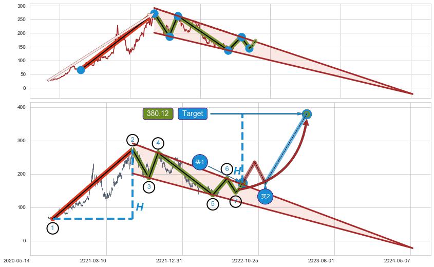 ➢ 最小中继整理涨幅→𝐇: 207.53 (𝐇楔型旗杆的长度:楔型起点→顶点)