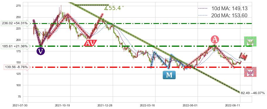 ♘ 阻力价格位185.61,可信任强度70.02%,距离最后交易2022-08-12形成的收盘价格152.95相差 +21.36%