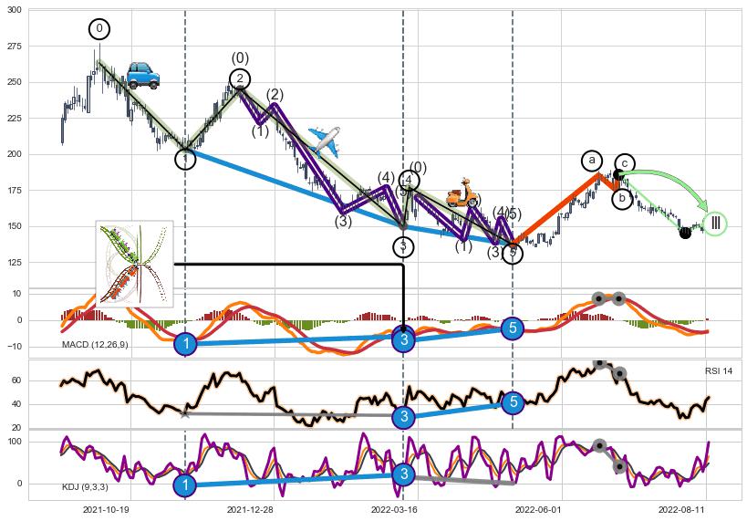 ➣ 1,3,5驱动浪MACD, RSI, KDJ走势都出现【常规背离】反转信号增强
