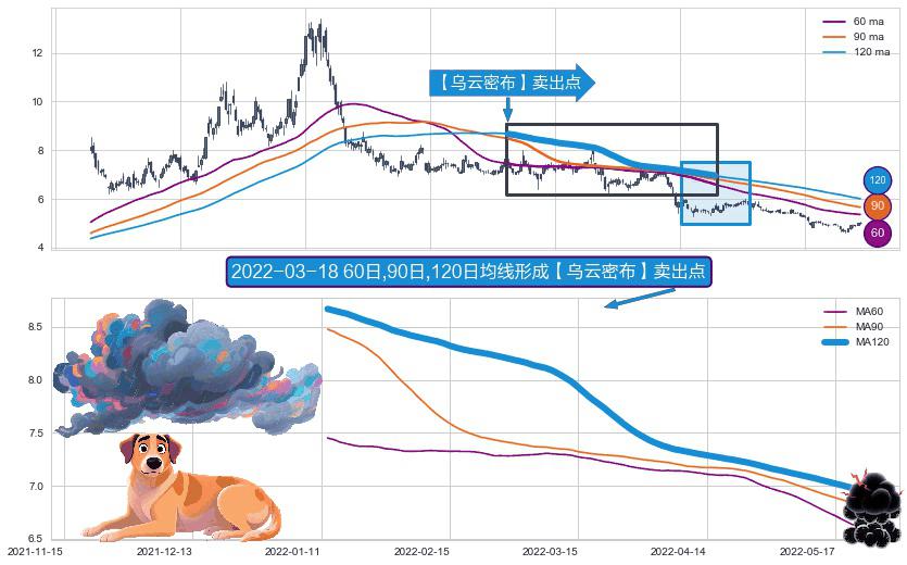 形态多维评估: ⚀ 2022-01-12日-2022-05-23日显现 60日-90日-120日均线 【乌云密布】卖出点 看空信号,后市看跌,卖出