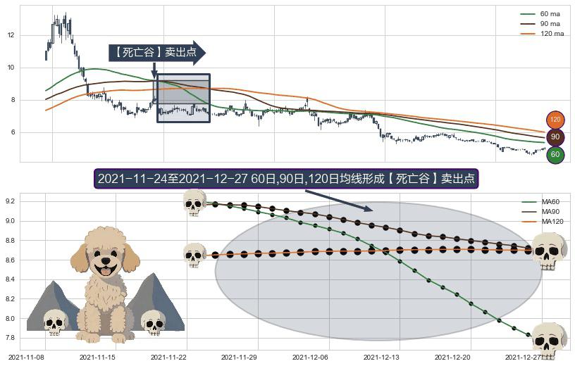 ⚂ 【死亡谷】卖出点 由MA60均线下穿MA90均线和MA120均线,MA90均线下穿MA120均线形成