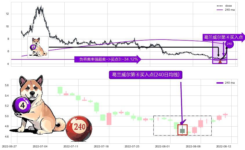 形态多维评估: ⚀ 2022-08-03-日显现 葛兰威尔均线 240日均线 第④买入点 下降趋势均值回复的短线反弹信号,后市看涨,买进信号