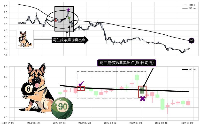 形态多维评估: ⚀ 2022-03-09-日显现 葛兰威尔均线 90日均线 第⑧卖出点 下降趋势的中继信号,后市看跌,卖出信号