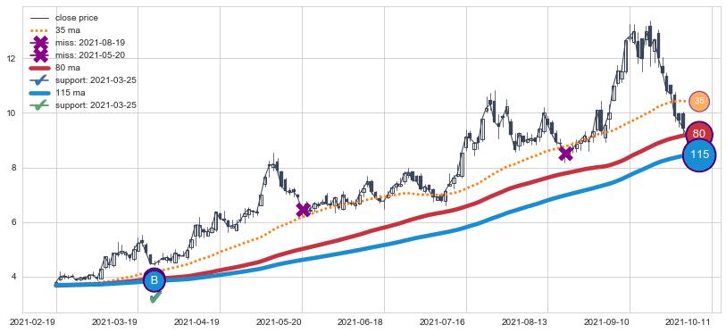 上涨趋势2021-02-19-2021-10-11,均线80, 115确认关键支撑1处