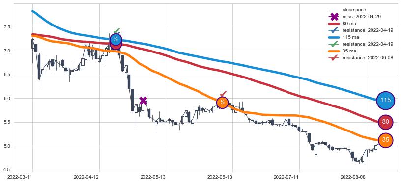 下跌趋势2022-03-11-2022-08-12,均线80, 35, 115确认关键阻力2处