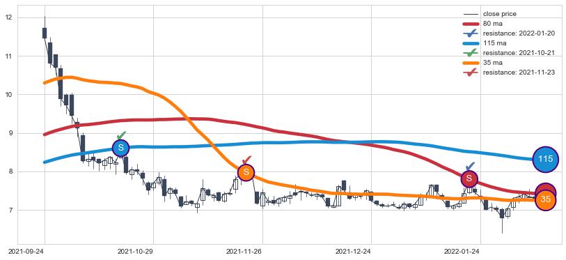 下跌趋势2021-09-24-2022-02-14,均线80, 35, 115确认关键阻力3处