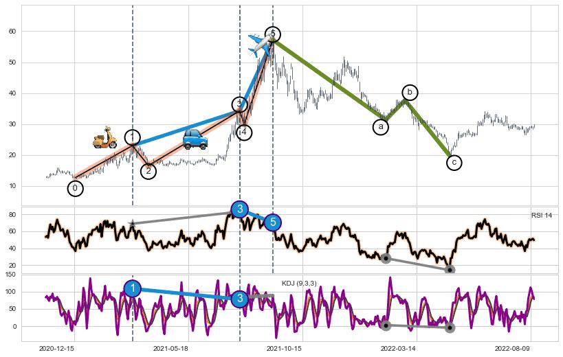 ➣ a,c调整浪MACD, RSI, KDJ走势都【未出现】背离,abc走势延续, 5浪反转概率增强