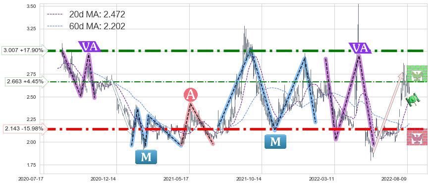 ♘ 阻力价格位2.663,可信任强度52.66%,距离最后交易2022-08-12形成的收盘价格2.550相差 +4.45%
