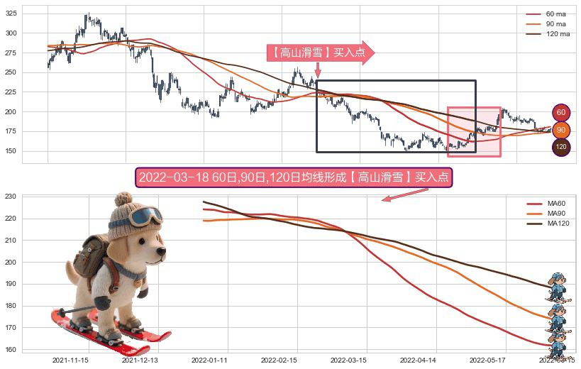 ⚀ 2021-12-30日-2022-06-06日显现 60日-90日-120日均线 【高山滑雪】买入点 看多信号,后市看涨,买入