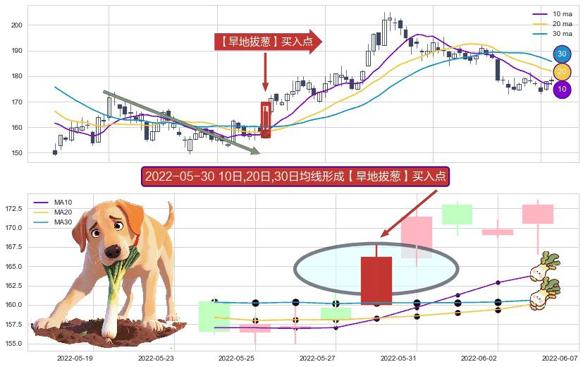 ⚀ 2022-05-30日显现 10日-20日-30日均线 【旱地拔葱】买入点 看多信号,后市看涨,买入