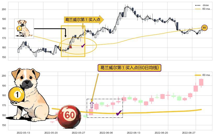⚀ 2022-05-30-日显现 葛兰威尔均线 60日均线 第买①入点 走势反转见底信号,后市看涨,买进信号