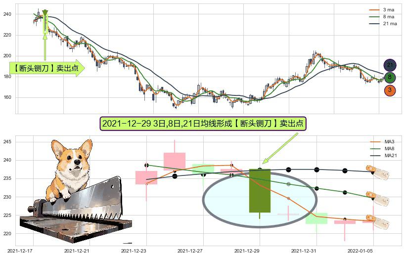 ⚀ 2021-12-29日显现 3日-8日-21日均线 【断头铡刀】卖出点 看空信号,后市看跌,卖出