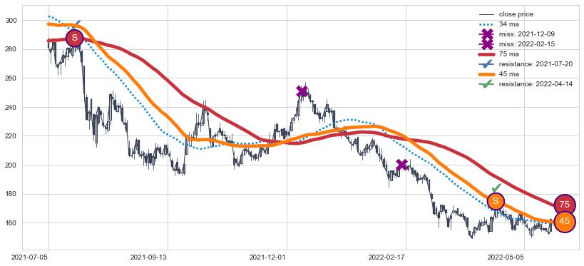 ⚂ 2022-06-28-日均线向上突破,2022-07-06-日重新下穿均线破位,均线阻力再次生效