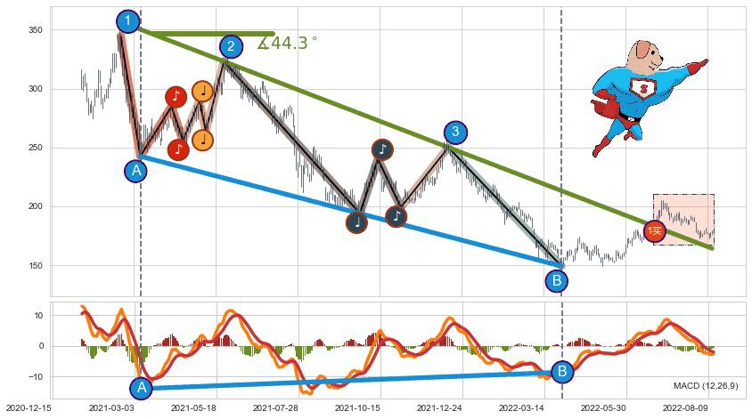 ➣ 2021-02-19-2022-04-19下跌趋势存在反转上涨[机会],虽然原下跌趋势的阻力位(164.18)已被突破,但其阻力效果尚存,原下跌趋势角度: 44.3˚