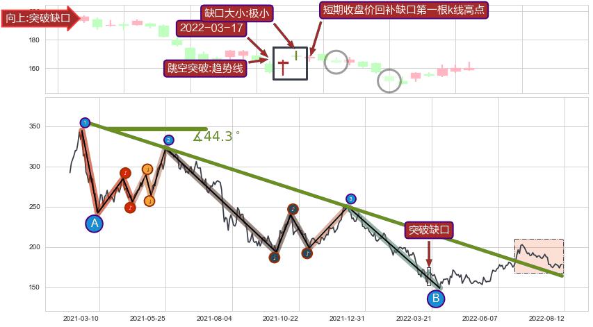 ➢ 突破缺口形成后,后续k已经超过14根,跳空突破趋势线关键点后, 出现【完全回踩】迹象,短期收盘价回补缺口第一根k线高点