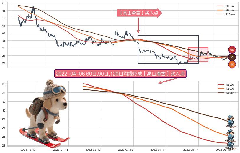形态多维评估: ⚀ 2022-01-24日-2022-06-13日显现 60日-90日-120日均线 【高山滑雪】买入点 看多信号,后市看涨,买入