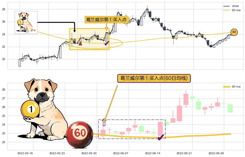 形态多维评估: ⚀ 2022-05-31-日显现 葛兰威尔均线 60日均线 第买①入点 走势反转见底信号,后市看涨,买进信号