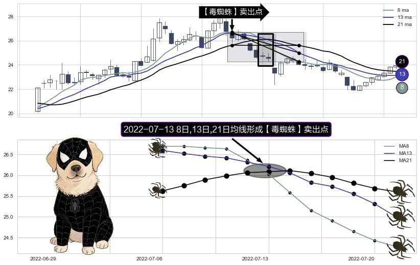 形态多维评估: ⚀ 2022-07-13日显现 8日-13日-21日均线 【毒蜘蛛】卖出点 看空信号,后市看跌,卖出