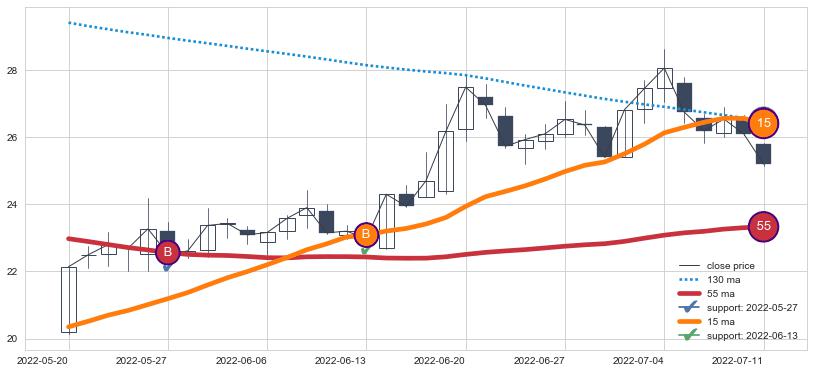 上涨趋势2022-05-20-2022-07-11,均线15, 55确认关键支撑2处
