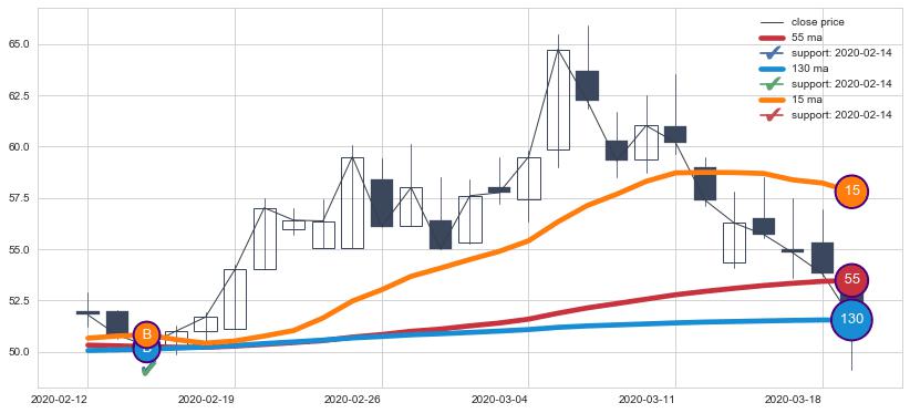 上涨趋势2020-02-12-2020-03-19,均线130, 15, 55确认关键支撑1处