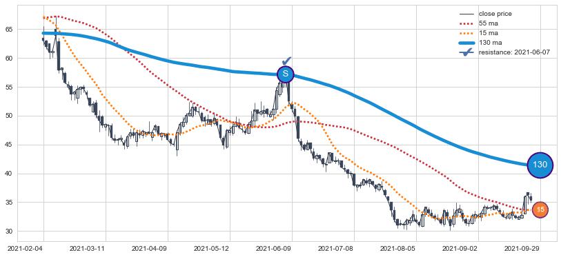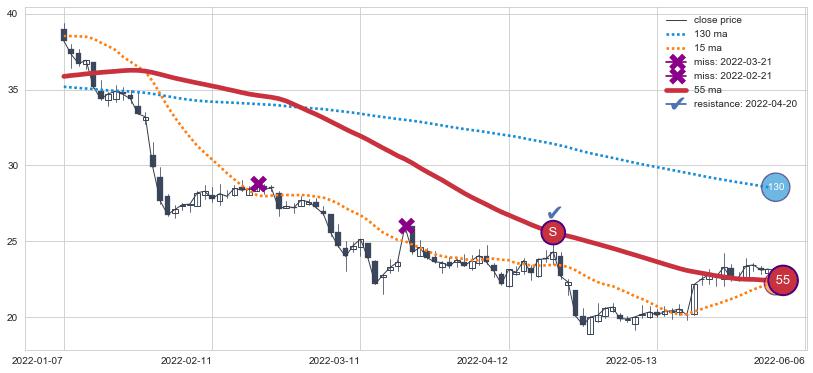 下跌趋势2022-01-07-2022-06-06,均线55确认关键阻力1处