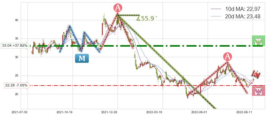 ♘ 阻力价格位33.04,可信任强度96.27%,距离最后交易2022-08-12形成的收盘价格23.97相差 +37.82%
